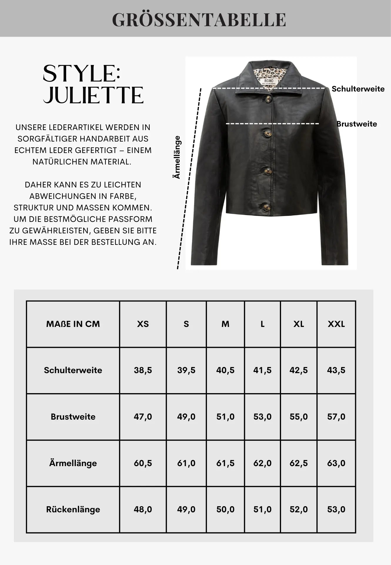 Die handgefertigte Juliette Lederjacke wird aus feinsten Materialien gefertigt, was ihre außergewöhnliche Qualität und Langlebigkeit garantiert. Das geschmeidige Leder schmiegt sich perfekt an Ihre Silhouette an und sorgt für ein dauerhaft angenehmes Tragegefühl.